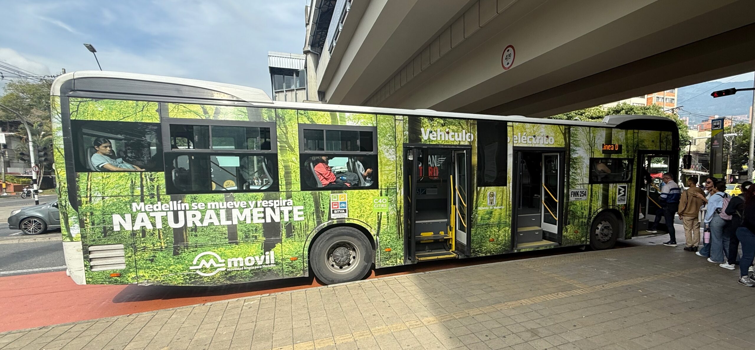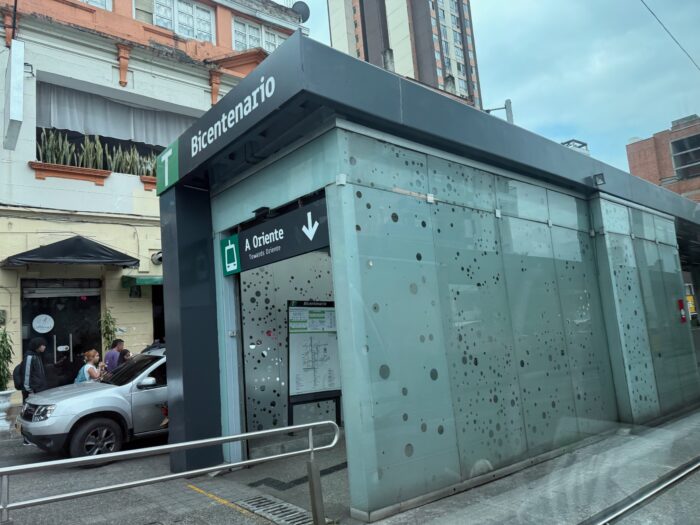 «Medellín se mueve y respira naturalmente», proclama el letrero. Pero ¿por qué aparece esto en el mapa del «metro», con una designación de letra? Tiene paradas más bonitas que una parada de bus convencional, pero está atrapado en el tráfico como cualquier bus ordinario. Esta es, de hecho, la única línea del mapa que no representa un servicio diseñado, al menos en teoría, para estar protegido de los retrasos del tráfico.