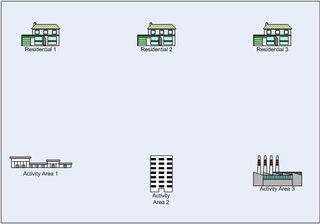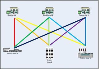 Imagine a simple city that has three primary residential areas, along the top in this diagram, and three primary activities of employment or activity, along the bottom.
