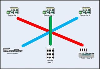 In designing a network for this city, the first impulse is to try to run direct service from each residential area to each activity center. If we have three of each, this yields a network of nine transit lines: