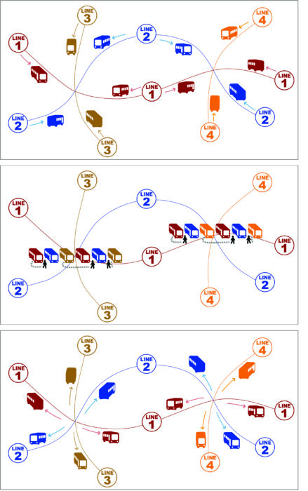 Often, pulses are organized around a main transit line, such as a trunk bus or rail line that takes you to a nearby larger city. In these cases, the main line vehicle usually doesn’t dwell as the local buses do, since it’s the most crowded service and hence the most speed-sensitive. Instead, the locals arrive a few minutes before the trunk passes through, and leave a couple of minutes after.