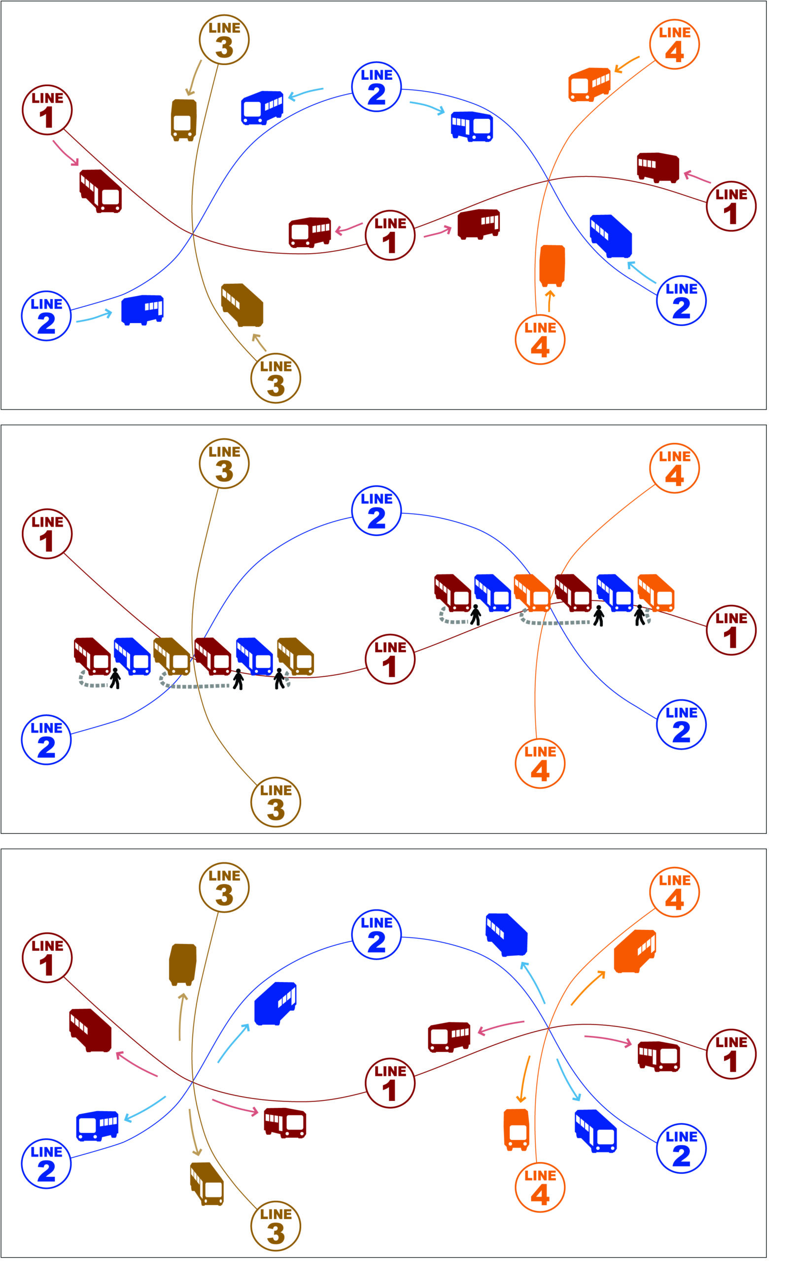 For this reason they are used almost universally, in North America, in small-city networks where frequencies are low and often also in suburban areas of large cities. If you’re in a North American suburb or small city and see a large number of buses hanging out together on a street corner, you’re probably watching a pulse.
