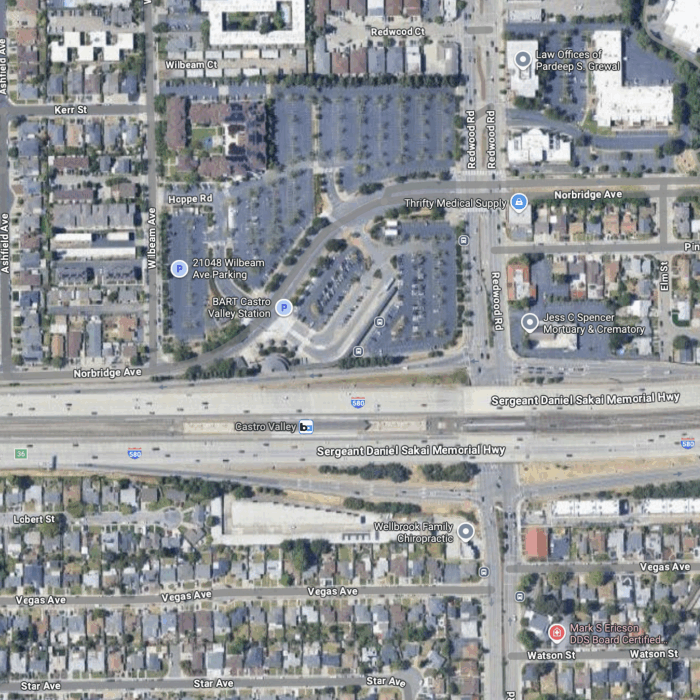 Castro Valley BART station, surrounded by parking and low-rise residential. Zoning such low densities around rapid transit is no longer legal under SB 79.