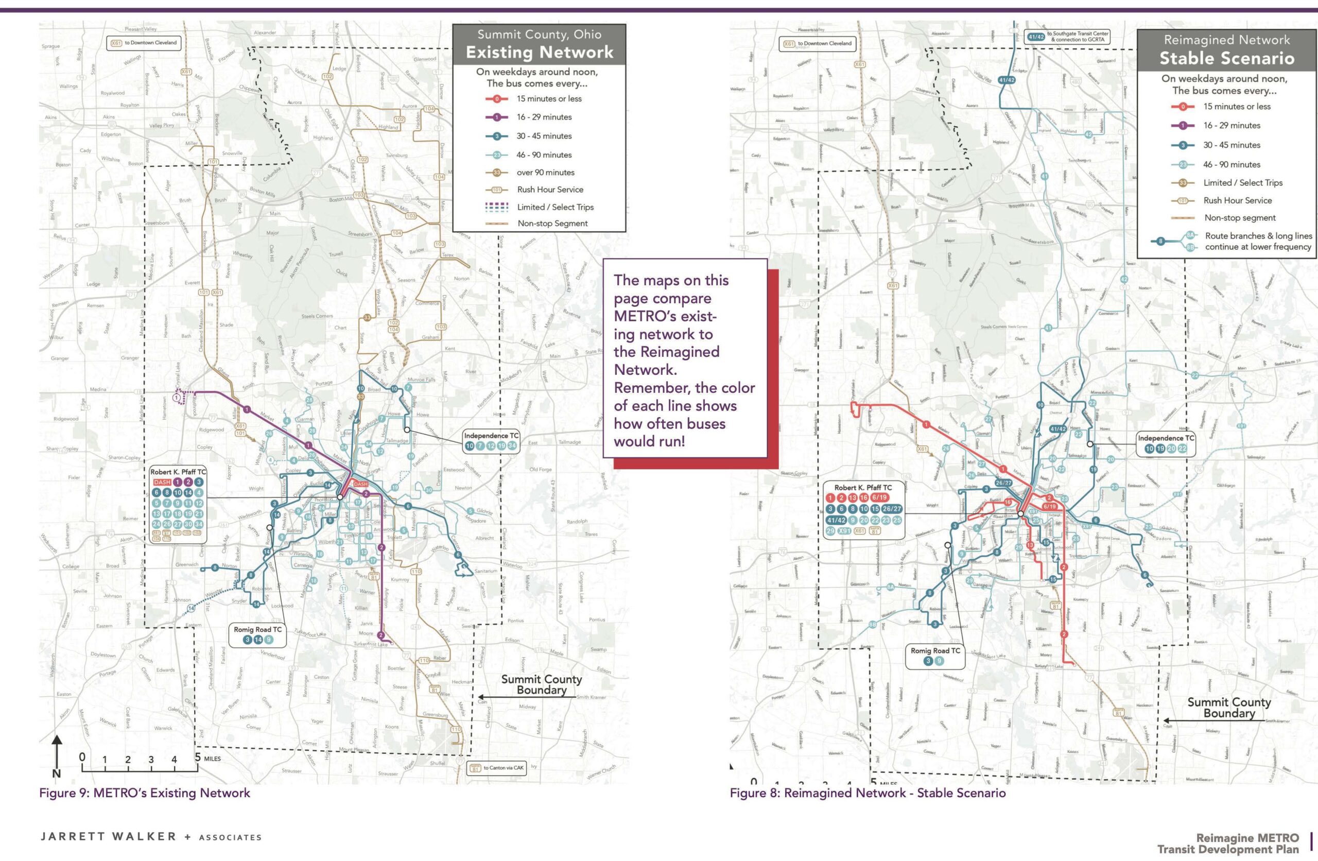 - We’re especially proud of what was possible in the vast rural area north of Akron, which borders the Cleveland urban area just off the map to the north. This area had an ineffective tangle of “express” services that ran just a few trips a day, and that were highly specialized around certain employers even though there wasn’t much ridership. The place replaced them with a simple pattern of a half-hourly service all the way from Akron to Southgate (north off the map) which is a major hub for Cleveland RTA services. The half-hourly service splits into two hourly strands in the rural area, to cover more territory, but converges at both ends to provide 30 minute frequency where demand is higher, and to provide 30-minute frequency all the way from Akron to Southgate. Our analysis of outcomes at the time showed that the Reimagined network would be immensely more useful in connecting people in Akron and Summit County to the places they need to go. In 45 minutes or less: