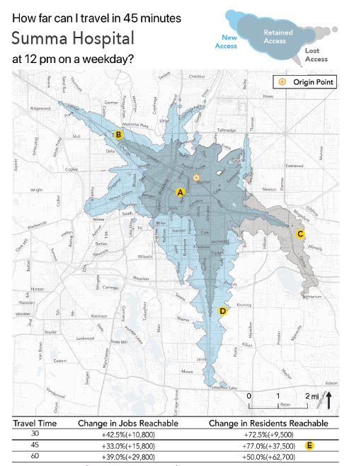 Major activity centers and destinations, such as Summa Hospital, saw even greater increases in access to people and jobs in the region. The isochrone example below shows how the new network increased the number of people who could reach the hospital in 45 minutes by 77%. These kinds of access gains are the reason we knew that this new network would improve ridership relative to the previous network.