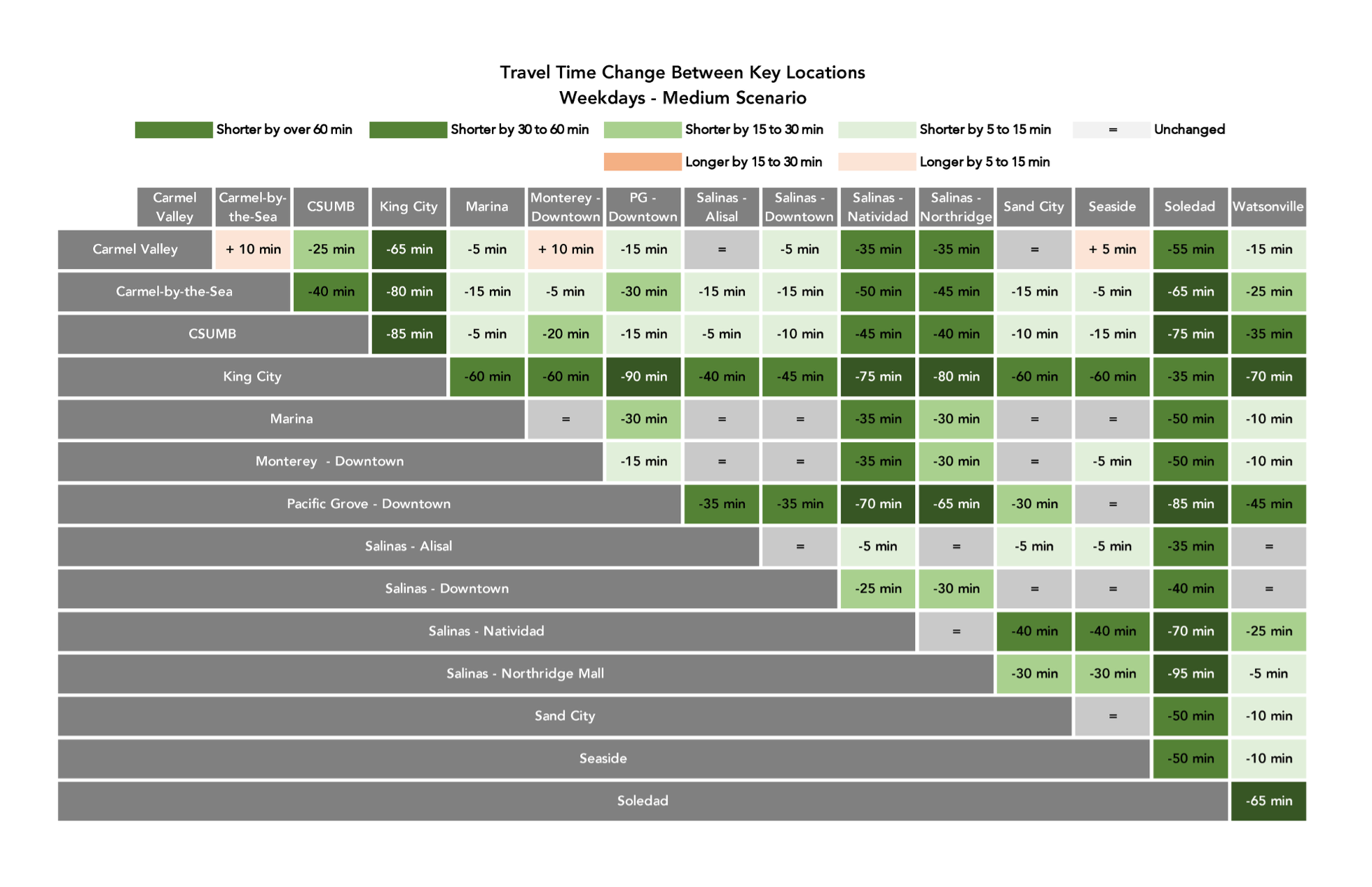 Carmel Valley, the only area with travel time losses, is a rural and mostly affluent area. The vast majority of the region saw huge travel time savings, especially in the lower-income valley communities of Salinas, Soledad, and King City.