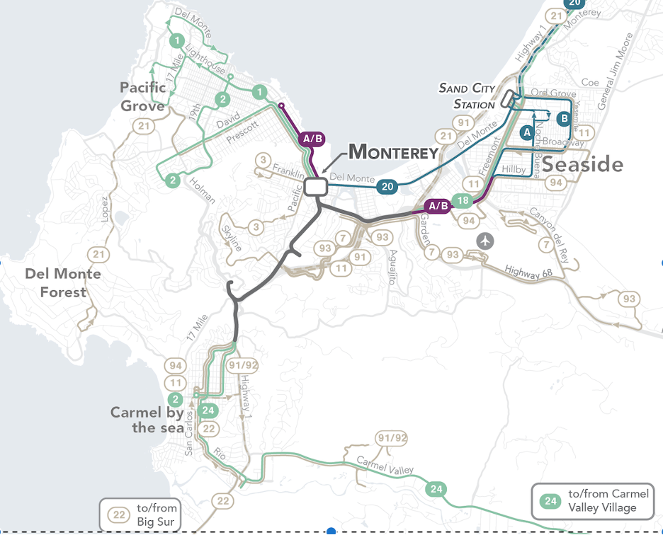 Old Monterey Peninsula network. Colors mean all-day frequency. Purple means every 20 min, blue means every 30 min, pale green means every 60 min, and pale beige means worse than every 60 min.