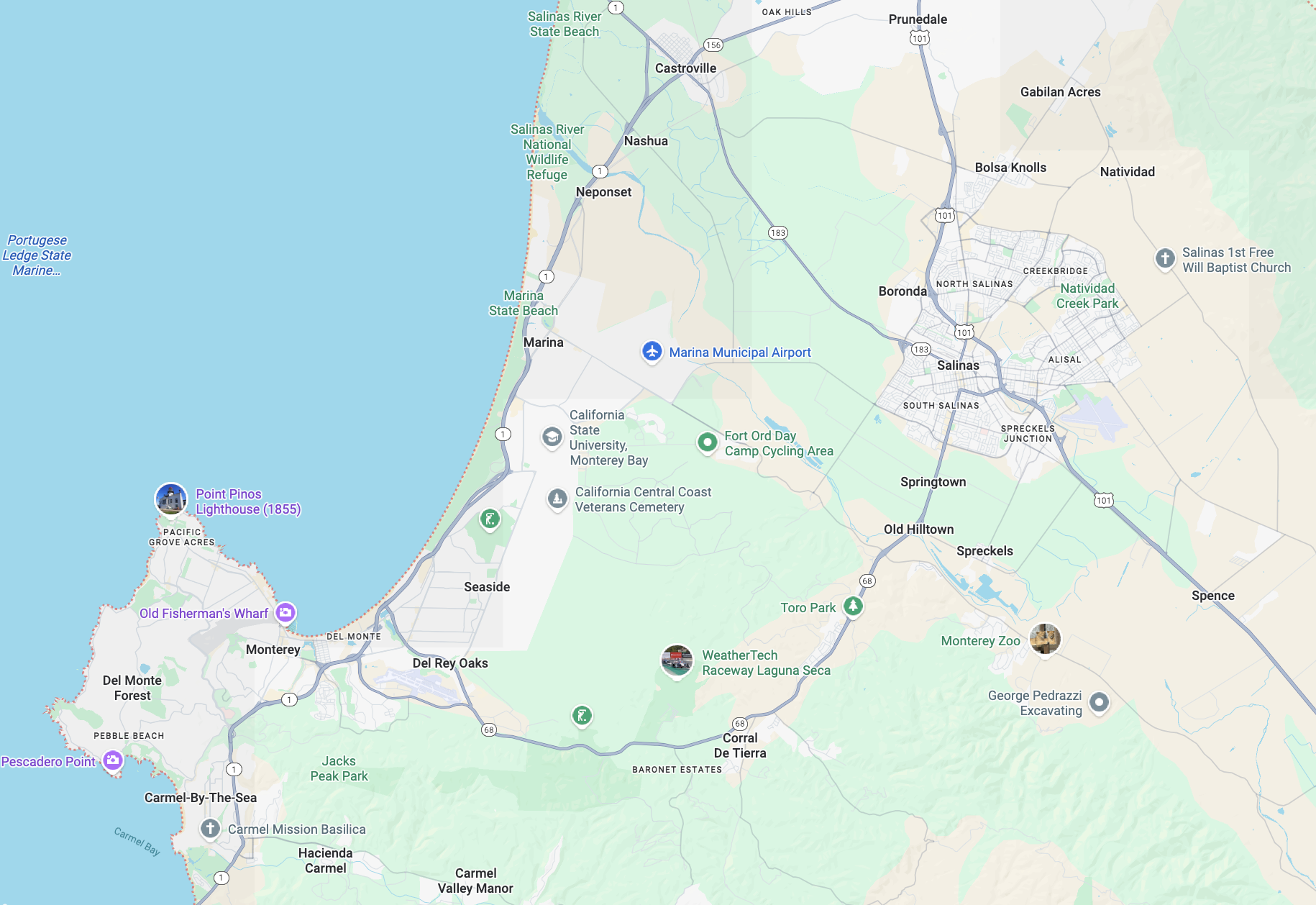 Urbanized areas of Monterey County. Big Sur is in the county, much further south along the coast. Along Highway 101, the county also extends further south in a long agricultural valley. Google Maps.