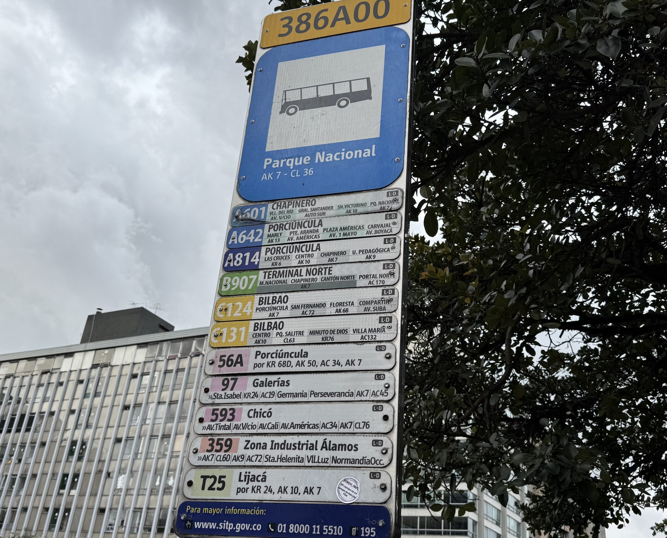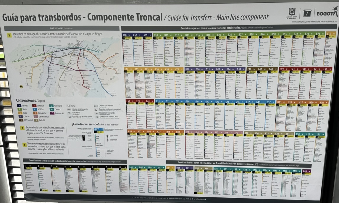 That’s a lot of flavors of buses, all going down the same street in the same general direction. You already know that route numbers beginning with A, B, and C mean that those buses will eventually end up running on those corridors of the busway, though it’s anyone’s guess whether that segment is in the future or the past relative to this sign. And there are so many other routes on top of each other. This is what the network looks like at street level, stripped of the relative clarity of the big busway stations. There is information here — Bogotá’s numbered grid system means that a practiced rider can decode much of it — but the cognitive load is immense, and for a newcomer it is simply a wall of text.